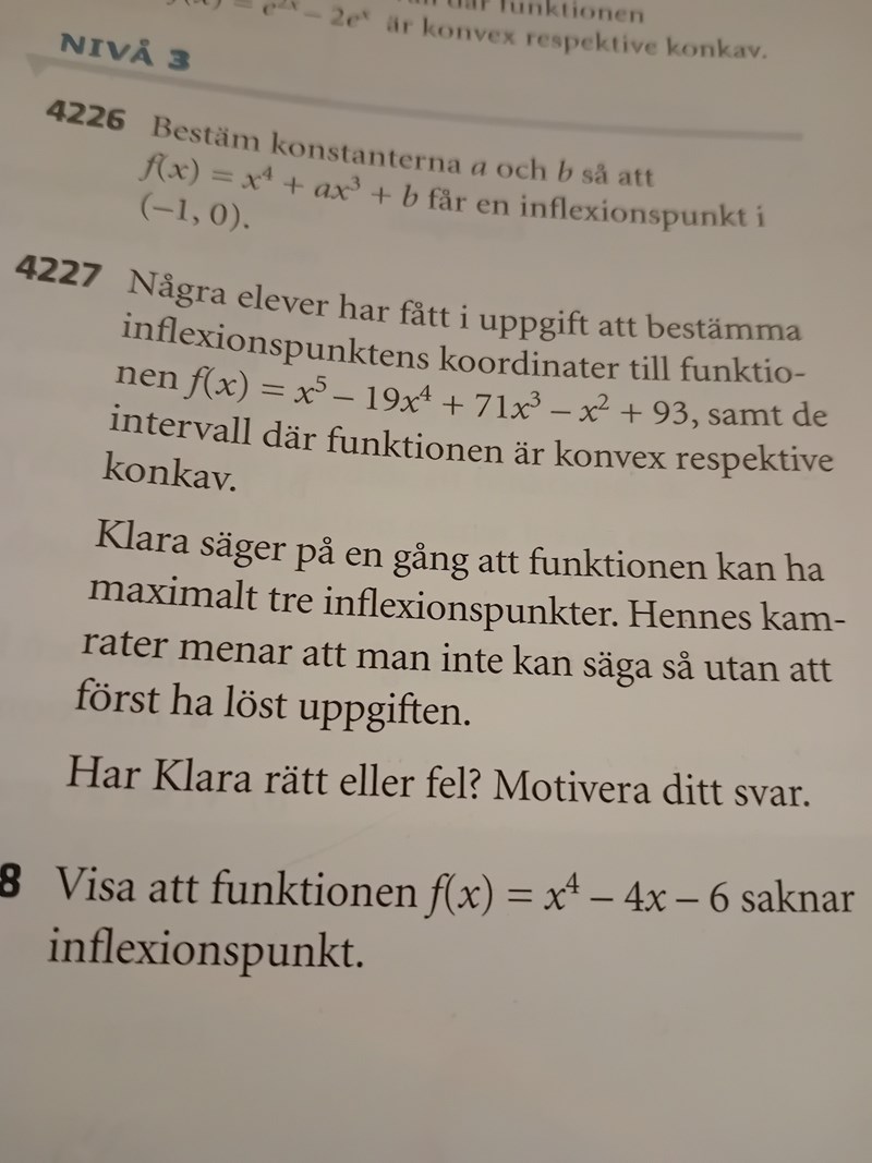 Då f(x) är av grad 5 kommer f''(x) vara av grad 3 som har maximalt 3 unika lösningar varför Klara har rätt.