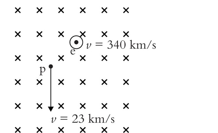 Magnetfältet går rakt in i papperet (kryss) och elektronen går rakt ut ur papperet (punkt), så de är parallella.