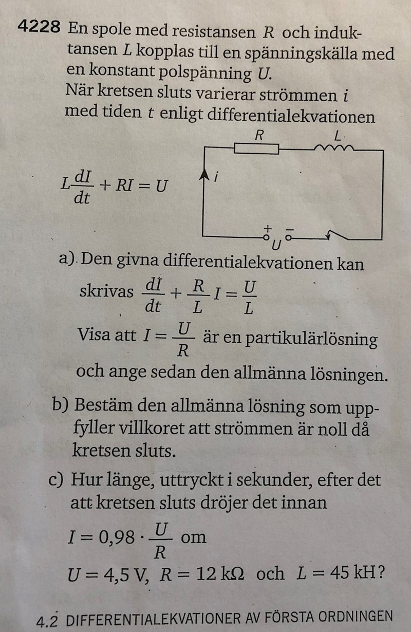 Men hur ska jag tänka på b)-uppgiften? I är ju strömmen så jag antar att I=0 men hur ska jag ha med "då kretsen sluts"