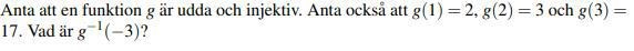 Applicera nu g på båda sidor: g(g-1(-3))=g(x)  -3=g(x), eftersom g och g-1 är varandras inverser.