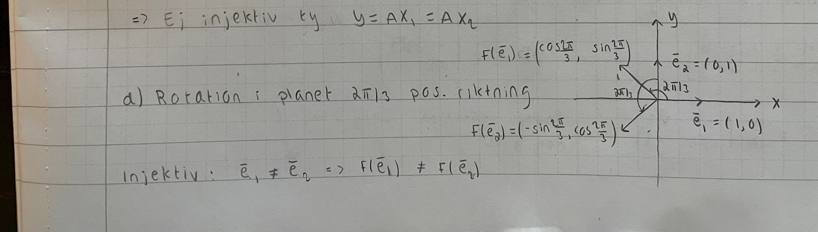 Jag har en uppgift där jag ska avgöra injektivitet genom geometrisk tolkning. Se bild. När det kommer till uppgift d) som är rotation i planet så vet jag inte hur jag ska tänka.