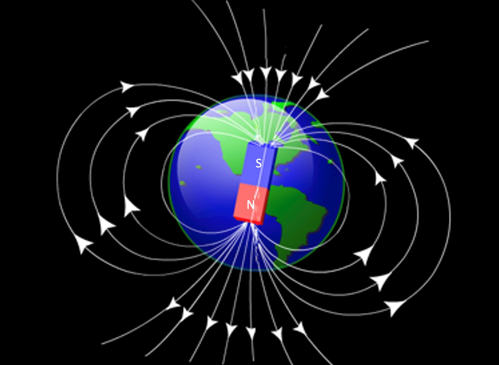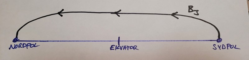 Där visade jag att fältlinjerna går snett ner mot jordytan nära nordpolen, parallellt med jordytan vid ekvatorn och snett ner mot jordytan nära sydpolen.
