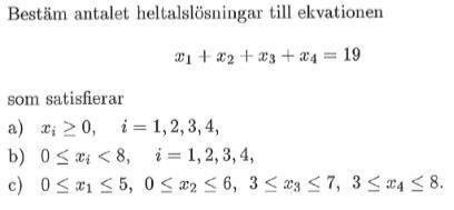 Problem b) löser du med samma metod som ovan efter att ha tagit bort fall där något x_i är större än 7. Här får du använda inklu/exklu.