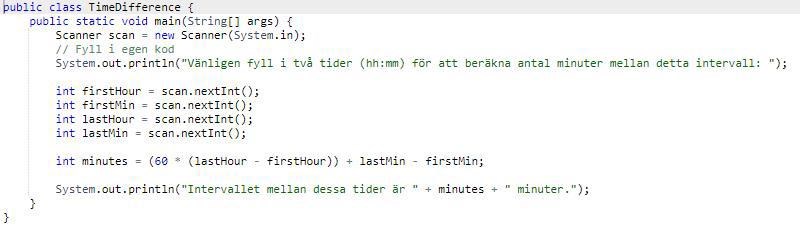 Programmet ska läsa en starttid (hh:mm) och en sluttid (hh:mm). Därefter ska beräkning ske med följd av utskrift på hur många minuter det är mellan dessa tider (sluttiden är större än starttiden och både starttiden och sluttiden är inom samma dygn).