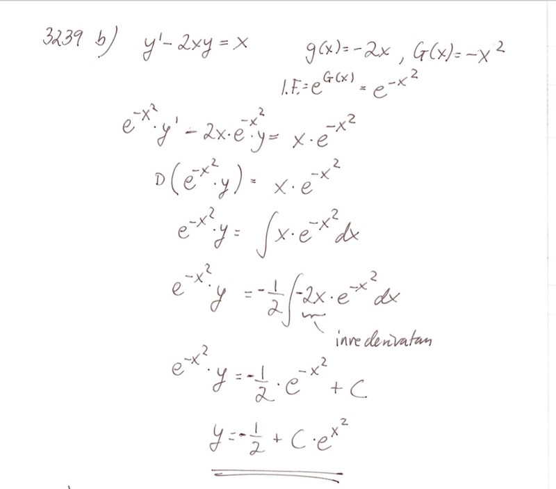Jag vet hur man ställer upp ekvationen och löser den, men vill veta mer om vad jag egentligen gör. Dvs, vad är det som ”händer” när jag hittat den inre derivatan för e^G(x) och löser integralen och då får en faktor att sätta in i funktionen för y. Varför ”försvinner” integraluttrycket?