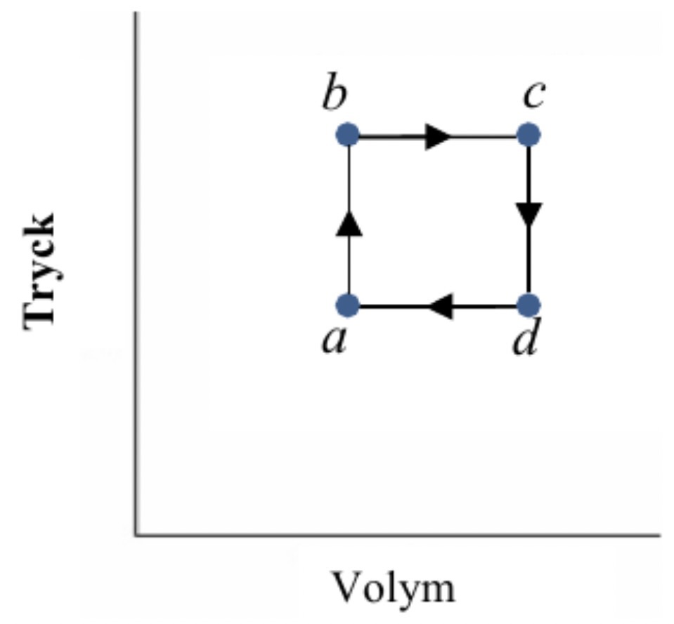Figuren visar en kretsprocess som genomgås av en ideal gas. I processerna ab och bc tillförs värme medan det bortförs värme i processerna cd och da. Trycket i a är pa, trycket i c är 2,08·pa, volymen i a är Va och volymen i c är 2,03·Va.