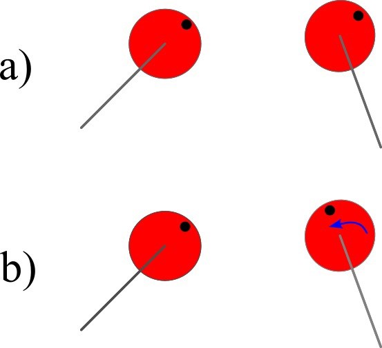 Ser du att man i b), där skivan sitter fast, kan se det som att den svarta bluppen roterar kring tyngdpunktscentrum. I a) däremot sitter den kvar på samma ställe.