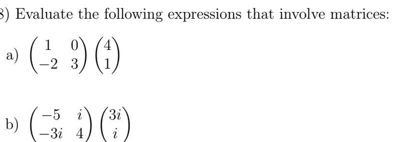 10-23typ 2×241typ 2×1=1·4+0·1(-2)·4+3·1=4-5typ 2×1.\displaystyle\underbrace{\begin{pmatrix}1&0\\-2&3\end{pmatrix}}_{\text{typ }2\times 2}\underbrace{\begin{pmatrix}4\\1\end{pmatrix}}_{\text{typ }2\times 1}=\begin{pmatrix}1\cdot 4+0\cdot 1\\(-2)\cdot 4+3\cdot 1\end{pmatrix} = \underbrace{\begin{pmatrix}4\\-5\end{pmatrix}}_{\text{typ }2\times 1}.