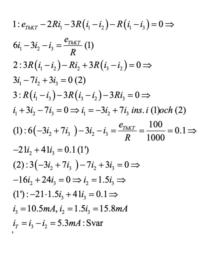 Jag är bara väldigt förvirrad varför vi i de andra uppgifterna får andra värden på den inre resistansen och e0, det jag inte ser är hur han får den där Rth för om K är kortslutet kan jag inte se någon parallellkoppling, jag ser att i T så blir det 2000 nere och 1000 uppe men inte mer än så... Hur skulle man kunna lösa uppgiften med en alternativ metod t.ex nodanalys? Det verkar inte funka dock då jag får följande funktioner men fel svar, jag får -0.02 A..: Förlåt för den slarviga bilden!