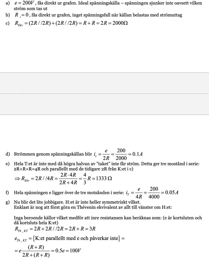 g) Jag tror jag är lite förvirrad här också, vi har ju redan att Ri = 0 så hur kan vi plötsligt räkna om den till att ha en resistans och samma med e=200. Och jag har svårt att se det med att kortsluta spänningskällan och hur man ska tänka med alla resistorerna som formar bokstäverna, måste man inte förenkla den sidan för att räkna kortslutningsström och tomgång??