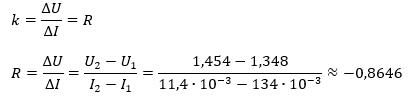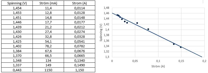 (Lite utanför: Den uppmätta spänningen är samma spänning som den som ligger över yttre resistansen R. Du kan alltså räkna ut vilken yttre resistans R som använts för varje rad i tabellen).