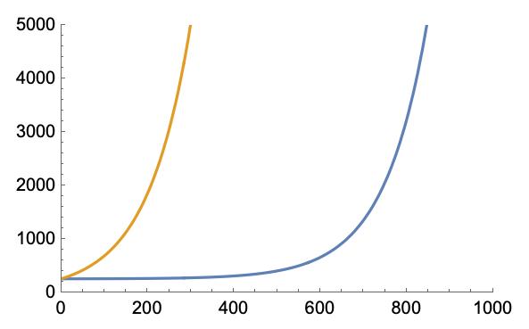 Ja, det stämmer för t=0 men P(t)=249+e^(0.01t) är att 249 individer står och tittar på när en insekt "fortplantar sig". Det är alltså endast en individ som står för fortplantningen och tillväxten kommer vara väldigt långsam i förhållandet till modellen ovan. (Ja, en insekt kan inte direkt fortplanta sig, men byt till celldelning...)