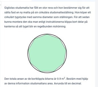 Jag tänker att man tar cikrlens area minus 9-hörningens area och då ska man få 0,9: