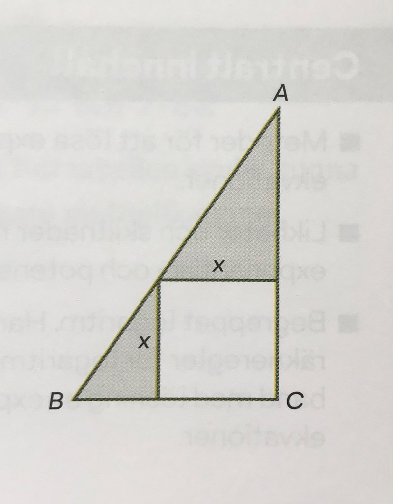 Hej! Efter figuren på bilden nedan ska jag visa att om sträckan AC = h och sträckan BC = b, så är kvadratens sida x = (bh)/(b+h)