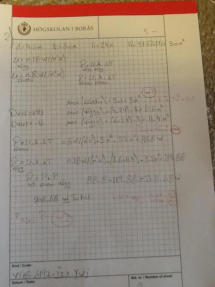 Det jag inte förstår du har räknat P(läckage)=0,3 är luftomsättningar *6 som är bredden * 4 som är djupet * 2,4 som är höjden.skall man fortsätta och multiplicera med 9 som är area (fönster) och multiplicera igen med 15 som är area (vägg) och * 37 K =