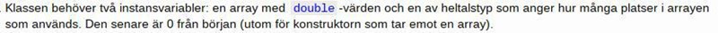 I en uppgift jag håller på med ska jag skapa en klass som gör att man kan skapa diverse arrayer, successivt lägga in värden och göra olika beräkningar på dem. Det första steget är att skapa en klass (check!) och sedan står det såhär:och sedan en konstruktor som skapar arrayer av en längd som anges då konstruktorn anropas.