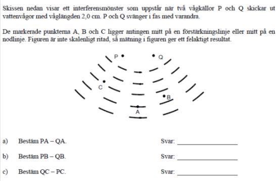 Jag förstår verkligen inte uppgiften ovan. Jag har svårt att se bilden framför hur vågorna från P och Q intefererar. De linjerna som är utritade, är de förstärkningslinjer eller nodlinjer och hur vet jag vilket avstånd som motsvarar en våglängd i den utritade bilden?