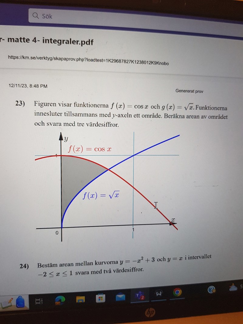 Slutligen kan du med integralberäkning ta fram arean för den sökta ytan eftersom du nu har gränserna för integralberäkning