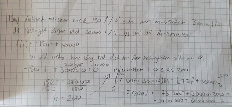 Så i b blir det lite klurigare. Du vill veta hur flödet förändras, vi kan kalla den okända för k (i a var k=-150). Vi säger också att tidpunkten när flödet blir 0 kallas för t, och k*t+30000=0, dvs t=-30000/k.