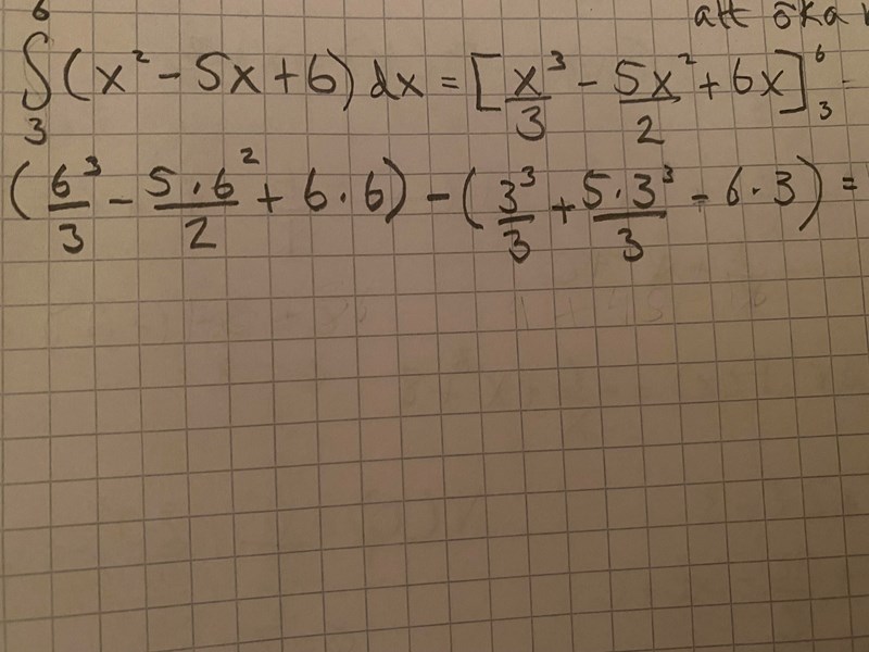 Hej jag ska räkna ut den här integralen (x2-5x+6)dx och har kommit en bit men få fel svar, någon som vet varför? Bifogar en bild på min beräkning.
