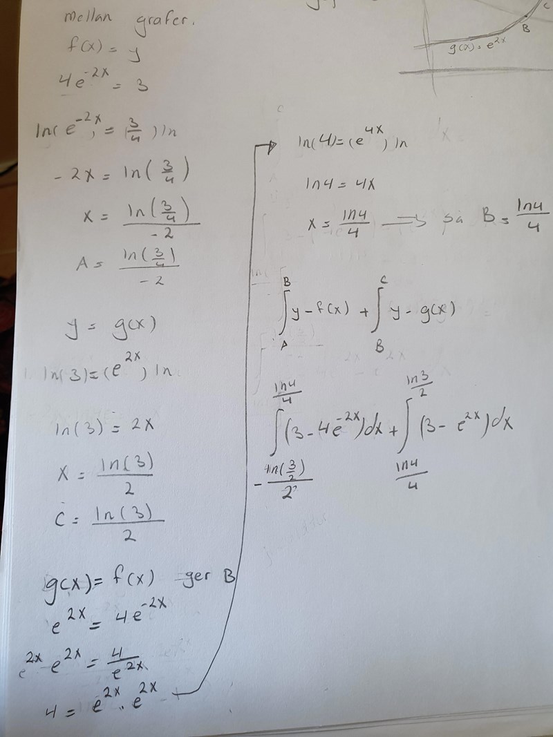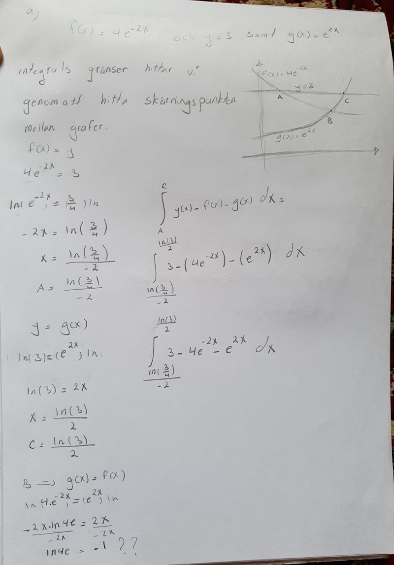 Smaragdalena skrev:Du behöver beräkna två integraler - en med y = 4e-2x som underfunktion (från A till B) och en med y = e2x som underfunktion (från B till C), båda med y = 3 som överfunktion.