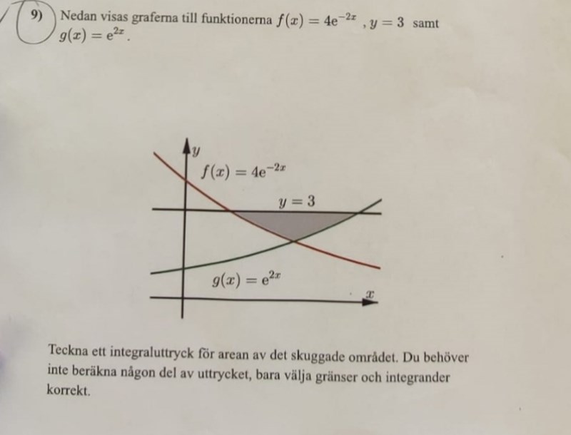 Ja det är ju skärningspunkten mellan f(x)=g(x) . Jag får x= ln4/4 men joculator har fått x=ln2/2