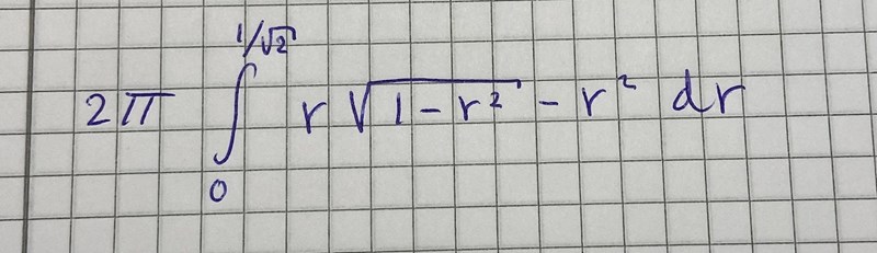 Sätt t =1-r2 Då är dt=-2rdr varför r (1-r2 )0,5 dr = -0,5 t0,5 dt . Den primitiva fknen till denna är -0,5 t1,5 /1,5 = -(1-r2 )/3. Glöm inte att integrera den sista termen -r2 i den ursprungliga integranden. Sätt sedan in gränserna.