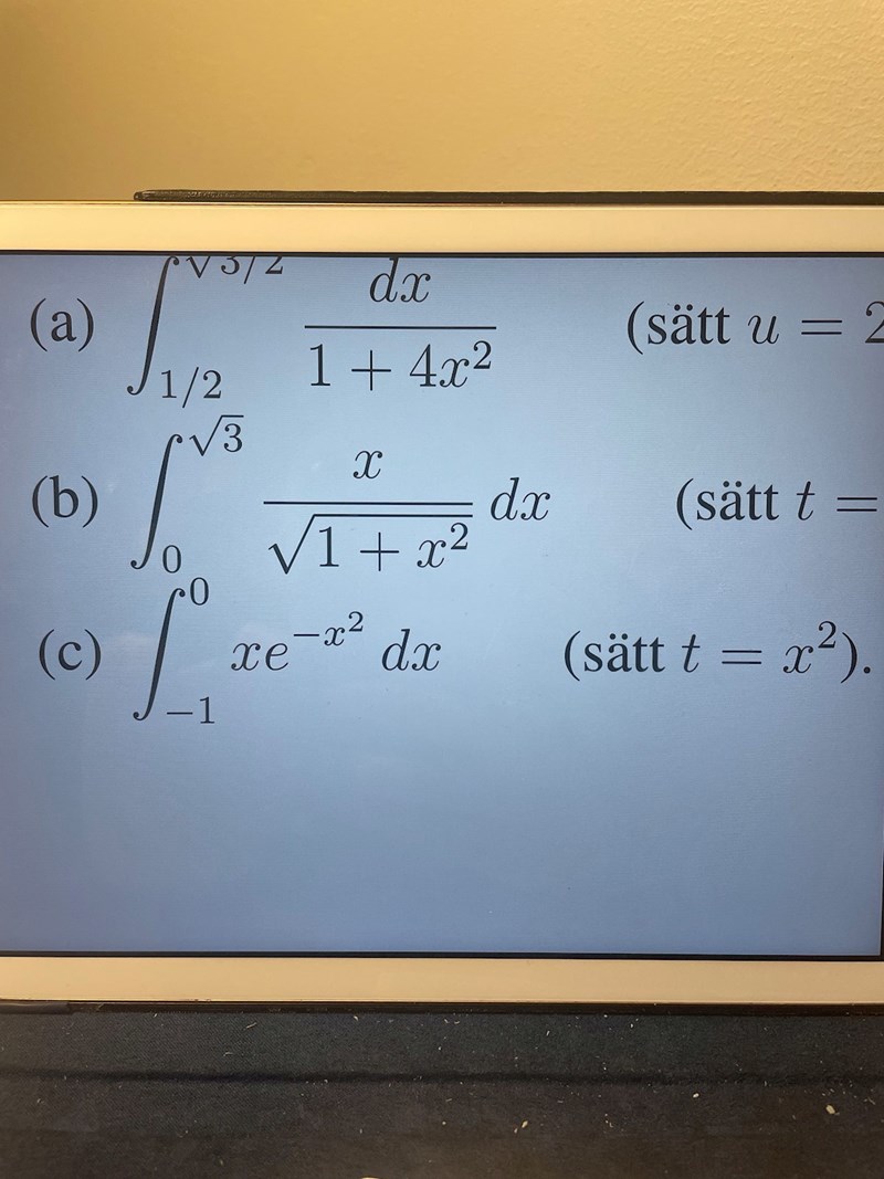Jag håller på med uppgift c) men kommer inte längre. Förstår inte hur jag ska hitta den primitiva funktionen till det senaste uttrycket i min beräkning.