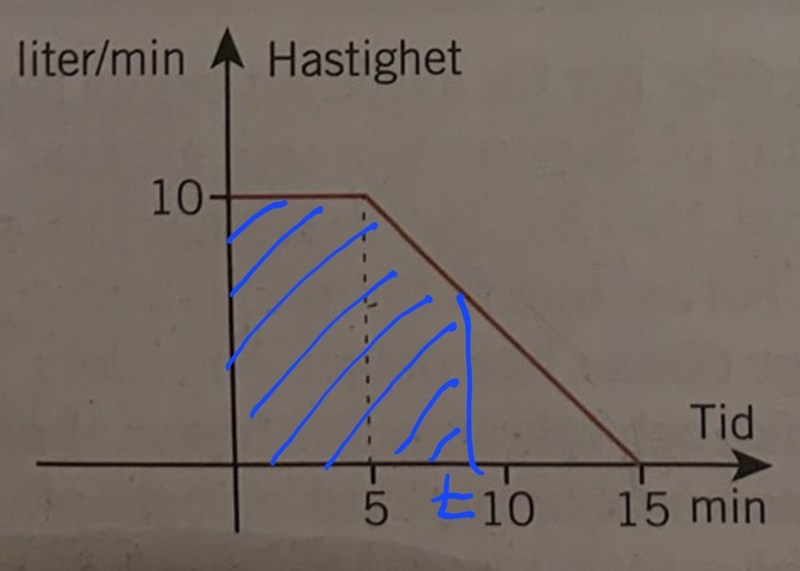 Om du är med på det så kan du fundera ut hur du kan teckna ett uttryck för den blåmarkerade arean i den här bilden, dvs då t > 5?