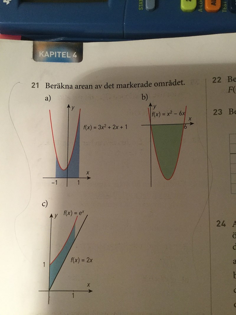 På 21a) ska jag beräkna arean på det markerade området. Men visst måste jag addera areorna och inte subtrahera?