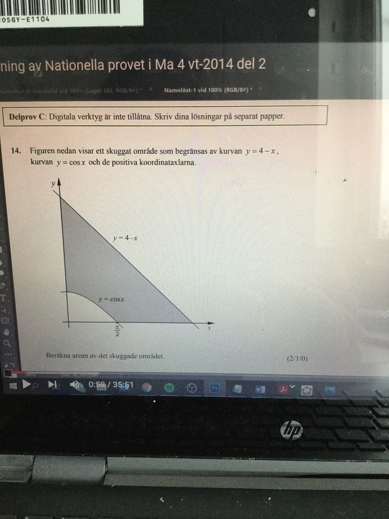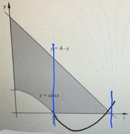 Enklaste sättet är nog att först beräkna arean av den rätvinkliga triangel som begränsas av koordinataxlarna och linjen y = 4-x och sedan från det subtrahera integralen av cos(x) från 0 till pi/2 (dvs den vita delen längst ner).