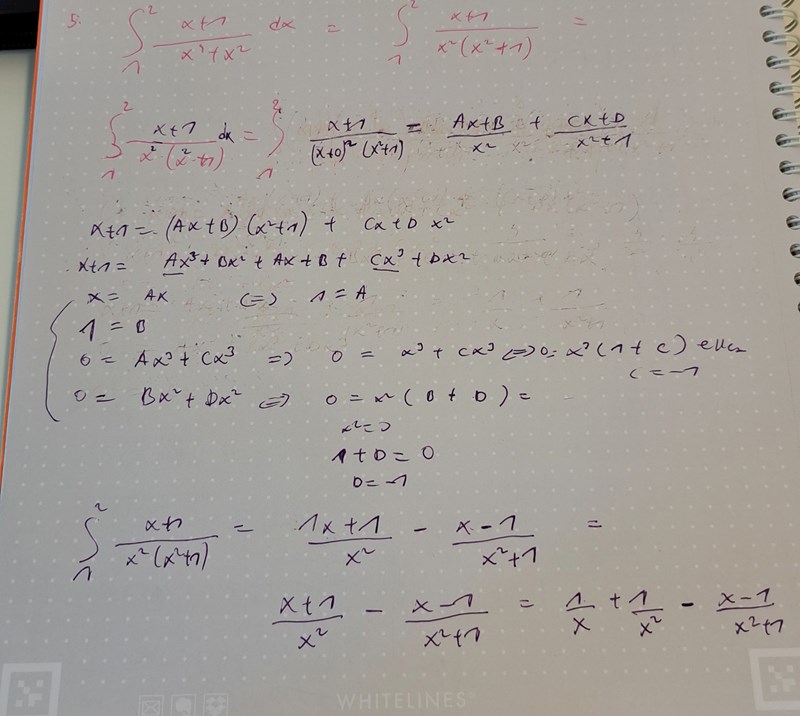 som liknar vår uppgift. Jag förstår ej varför vi ska ha A/x+B/x^2+Cx+D/x^2+1? Känns mer logiskt att det borde vara Ax+B/x^2+Cx+D/x^2+1.
