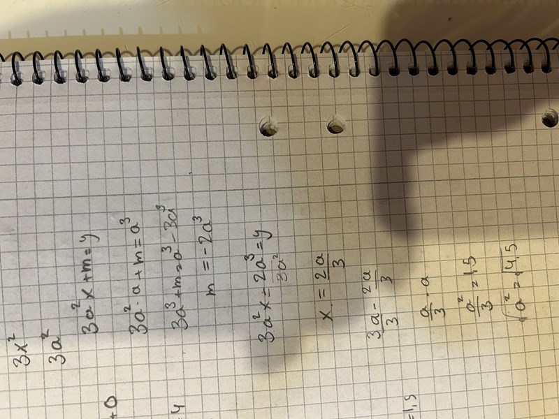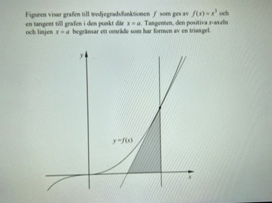Jag tänkte att jag deriverar och hittar lutningen för punkt a och sedan gör elvationen för tangenten sedan sätter den lika med noll för att få ut när den skär x axeln och dä fick jag 2a/3 och då vet jag att punkten längst ut är a därför tog jag a minus 2a/3 vilker ger mig basen av triangeln och sedan tar jag a/3 gånger a delat med två eller?