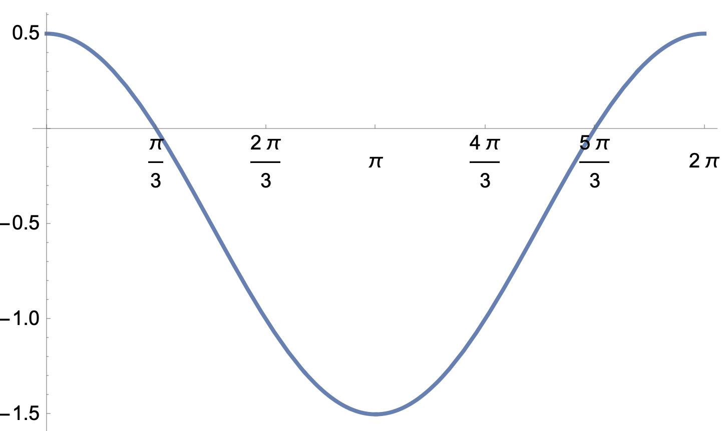 Jag tänker att integralen cos(x)-1/2 med gränserna 0,t ger att sin(k)-k/2. f’(t)= cos (t)0 för att identifiera extrempunkter. t=+-pi/3+n•2pi