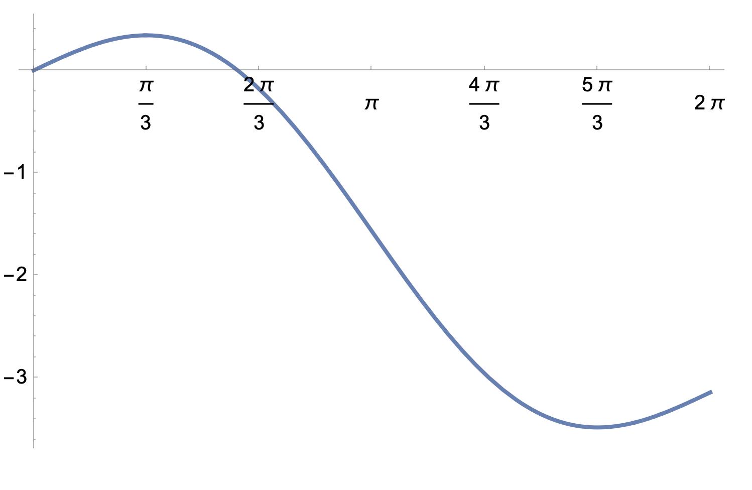 A''(k) = -sin(k) och A''(π/3)<0 och A''(5π/3)>0 varför k=5π/3 ger ett minimum som är A(5π/3)=-Sqrt3/2-5π/6