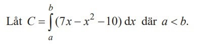 a) Jag inser att C kan ses som en area under grafen 7x - x - 10 från a till b. Denna ska vara så stor som möjligt. Nollställena är 5 och 2 så arean blir så stor som möjligt om jag integrerar mellan dessa. Så b är 5 och a är 2. b - a = 3, vilket är korrekt svar.