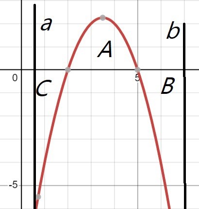 b) För det första ska C vara 0. Vad innebär det? Jo, det innebär att arean A ska vara lika stor som C och B. a och b ska vara så långt ifrån varandra som möjligt också för ju mindre a är desto bättre och ju större b är desto bättre. Men drar jag ut dem för långt så blir ju C mindre än 0. Om man kan placera ut b så tänker jag att man bör kunna placera ut a relativt enkelt för då har man nåt att utgå ifrån. Jag fick inte till det, kollade på lösningsförslaget och där stod att man ska ha en insikt om att a och b hamnar så långt ifrån varandra som möjligt om de är lika långt från symmetrilinjen x = 3,5.