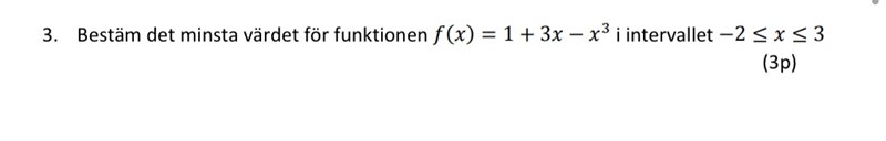 Kandidater till funktionens minsta värde är funktionsvärdena vid alla intervallets stationära punkter (dvs vid x = -1 och x = 1) och funktionsvärdena vid intervallets ändpunkter (dvs vid x = -2 och x = 3).