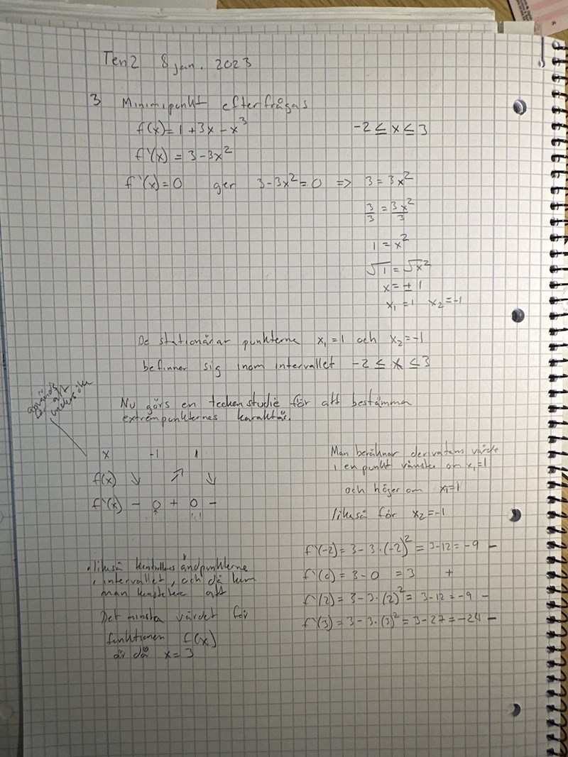 Ok, så genom att undersöka ändpunkterna så kan man konstatera att grafen fortsätter bli mer negativt då x=3 i f’(x). Typ minimipunkt