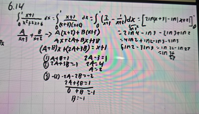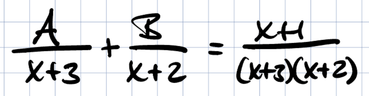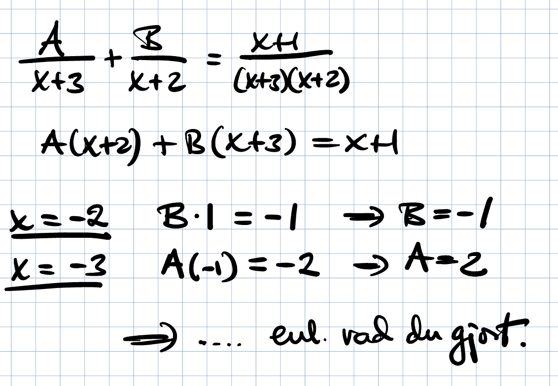 Det var inte den raden mitt inlägg handlade om utan raden A(x+2)+B(x+3)=x+1  Och den raden var en följd av: Antag att det finns konstanter A och B sådana att A/(x+3)+B/(x+2)=(x+1)/(x+2)(x+3).