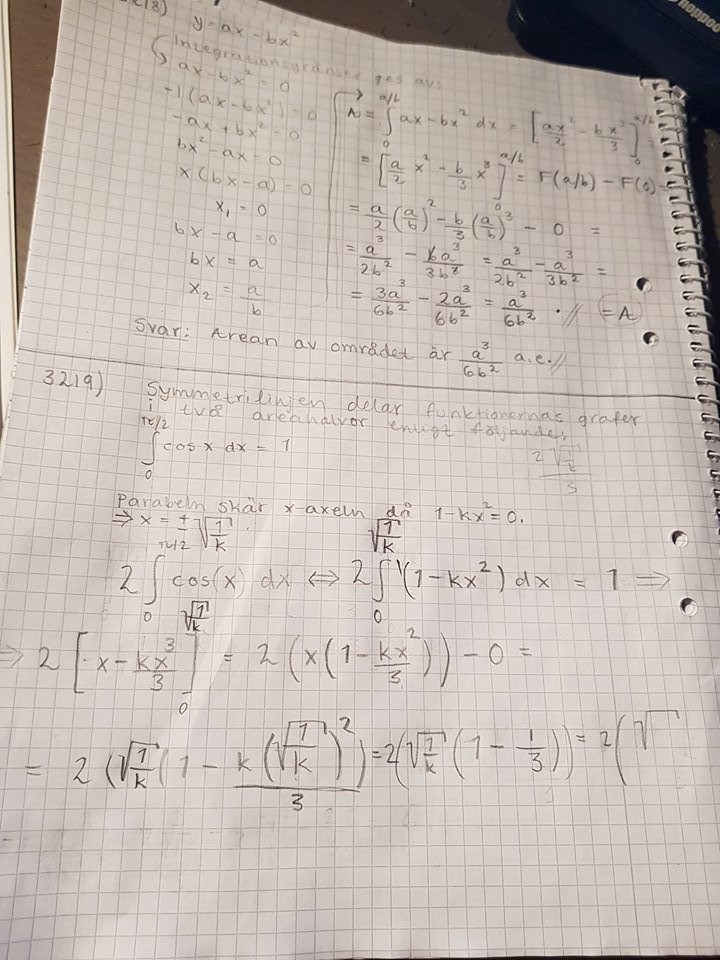 Yngve skrev :Fredrikottenfelt skrev :Funktionen y = cos x approximeras med y = 1 - kx 2 så att areorna enligt nedanstående figur blir lika. Bestäm konstanten k.