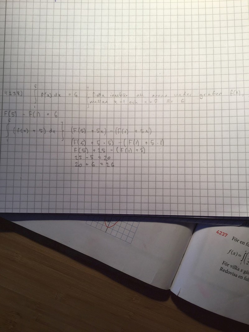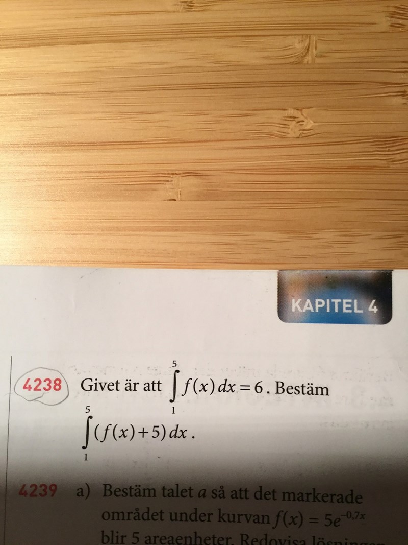 Integrera termerna var för sig. Då får du INT(f(x)) + INT(5) från x = 1 till 5 (ursäkta slarvigt skrivsätt). Den första termen är 6, den andra [5x] från 1 till 5.