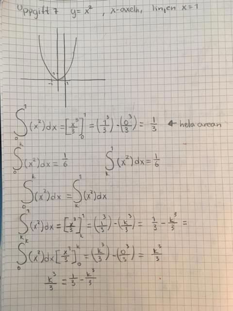 Uppgiften lyder Ett område begränsas av kurvan y = x2, x-axeln och linjen x = 1. Bestäm k, så att linjen x = k delar området i två lika stora delar.