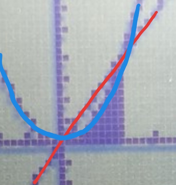 Nej om du zoomar in närmare så ser du att y = 2x är övre funktion och y = x^2 är undre funktion i det aktuella intervallet, se bild.