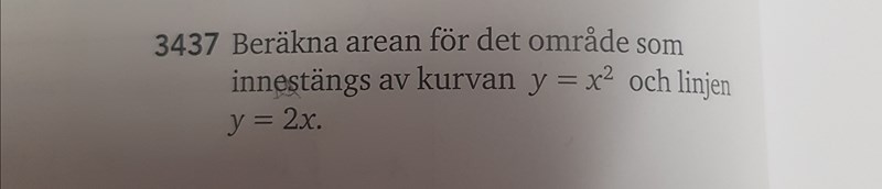 Laguna skrev:Din räknare verkar visa arean mellan y = x2 och x-axeln i stället. Arean du vill ha är den lilla vita remsan nedanför y = 2x.