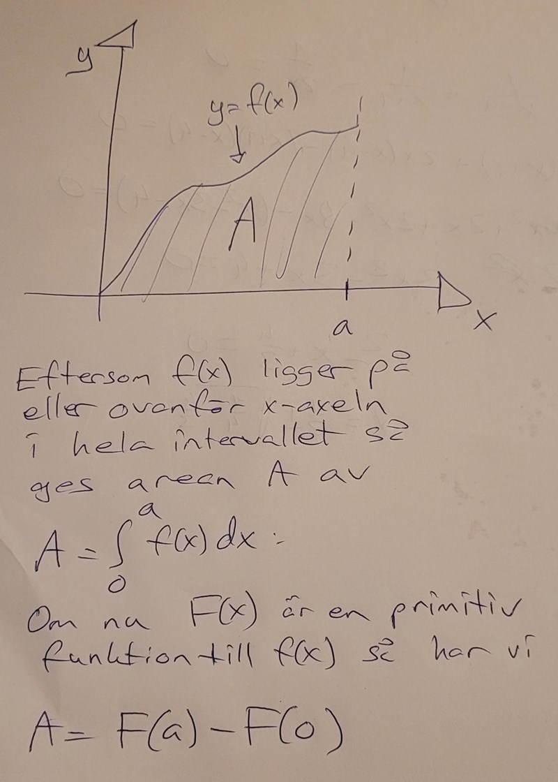 Om då grafen ligger på/ovanför x-axeln i hela intervallet så ska du integrera f(x) från 0 till x.