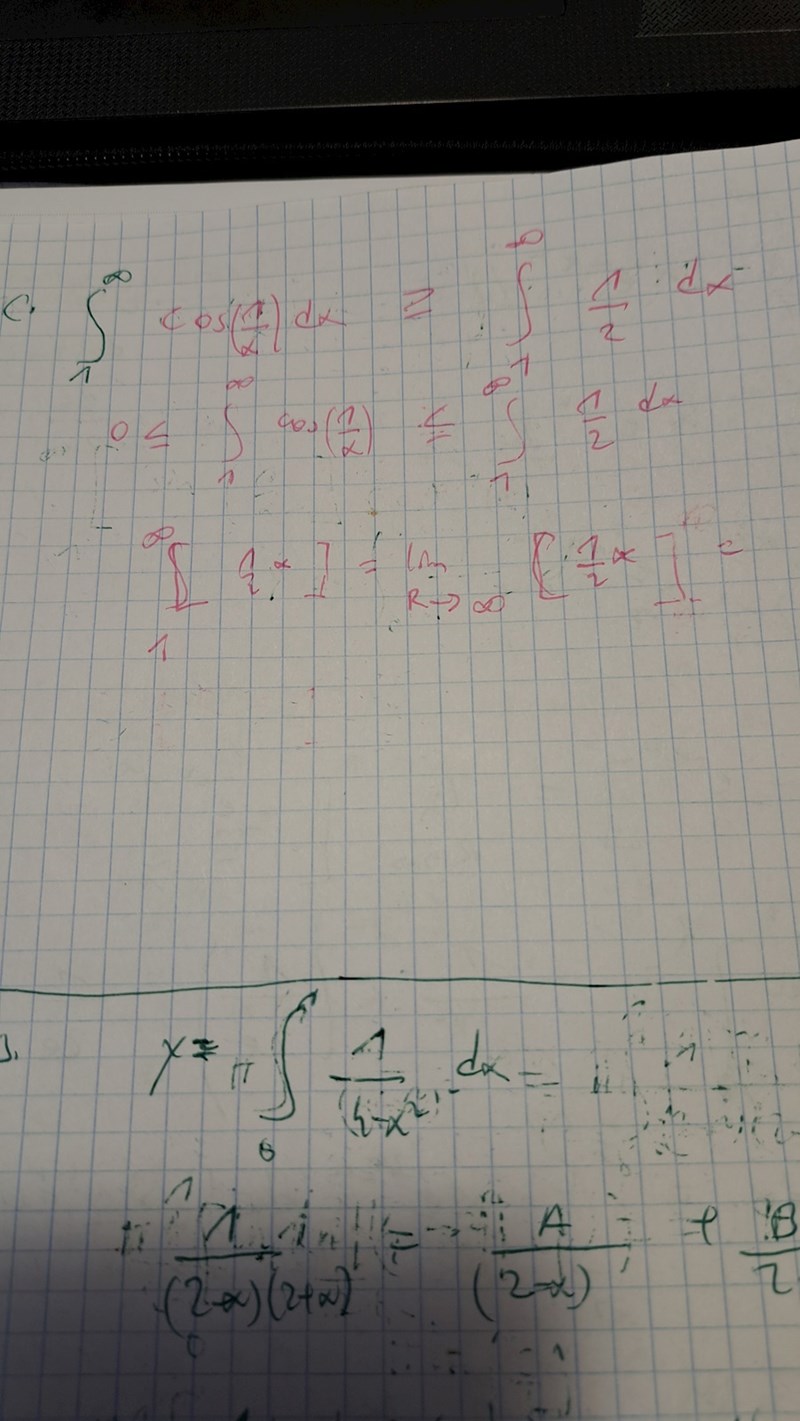 Tomten skrev:Som du själv skriver så konvergerar 1/x mot 0 när x går mot oändligheten. Eftersom cos-funktionen är kontinuerlig på hela R så måste således cos(1/x) gå mot cos 0 =1. För M stort nog måste då cos(1/x) >= 1/2 för alla x>M. (Som i den ovan givna ledningen.) Integralen från 1 till oändligheten av funktionen cos(1/x) måste då vara större än integralen från M till oändligheten av den konstanta funktionen 1/2. Men denna integral har oändligt värde, eftersom integrationsområdet är obegränsat. Därför är integralen divergent.