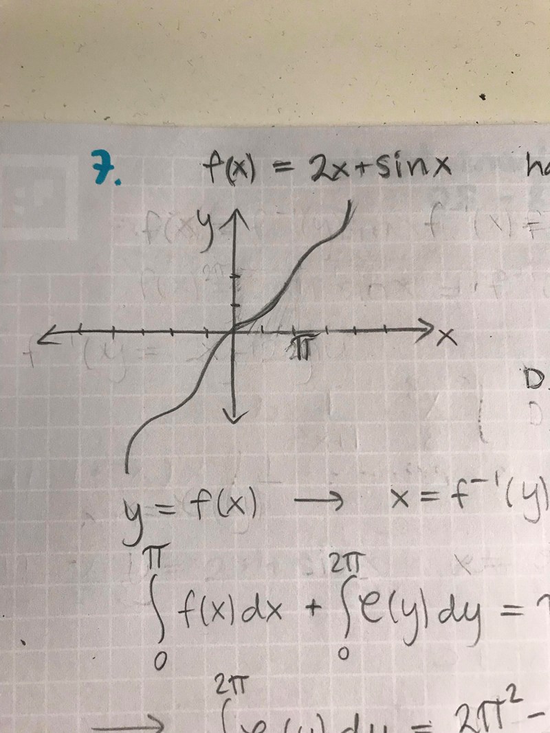 Funktionen f(x)=2x+sinx är inverterbar med invers p. Beräkna integralen p(y) dy från 0 till 2pi. (Ledning: rita kurvan f(x) och tolka integralen som en area.)
