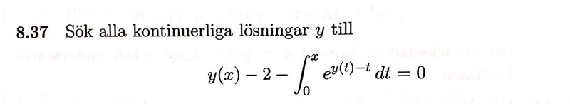 Hej, vet inte hur man löser följande ekvation. Prövade att flytta över så så jag bara har y(x) i V.L. Sedan deriverade jag och multiplicerade både sidor med e^(-y(t)).
