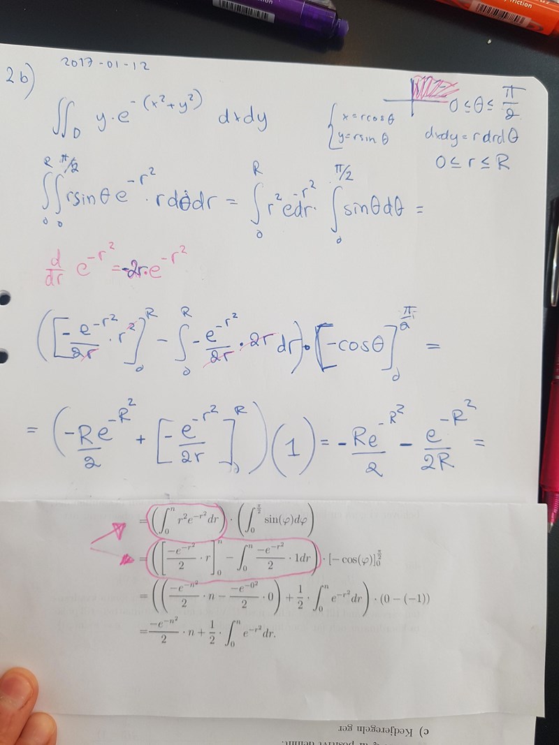 Det inringade steget är väl vanlig partialintegration? Med ena funktionen som re^r2 och andra funktionen som r. Sen har de helt enkelt låtit bli att integrera e^-r2.